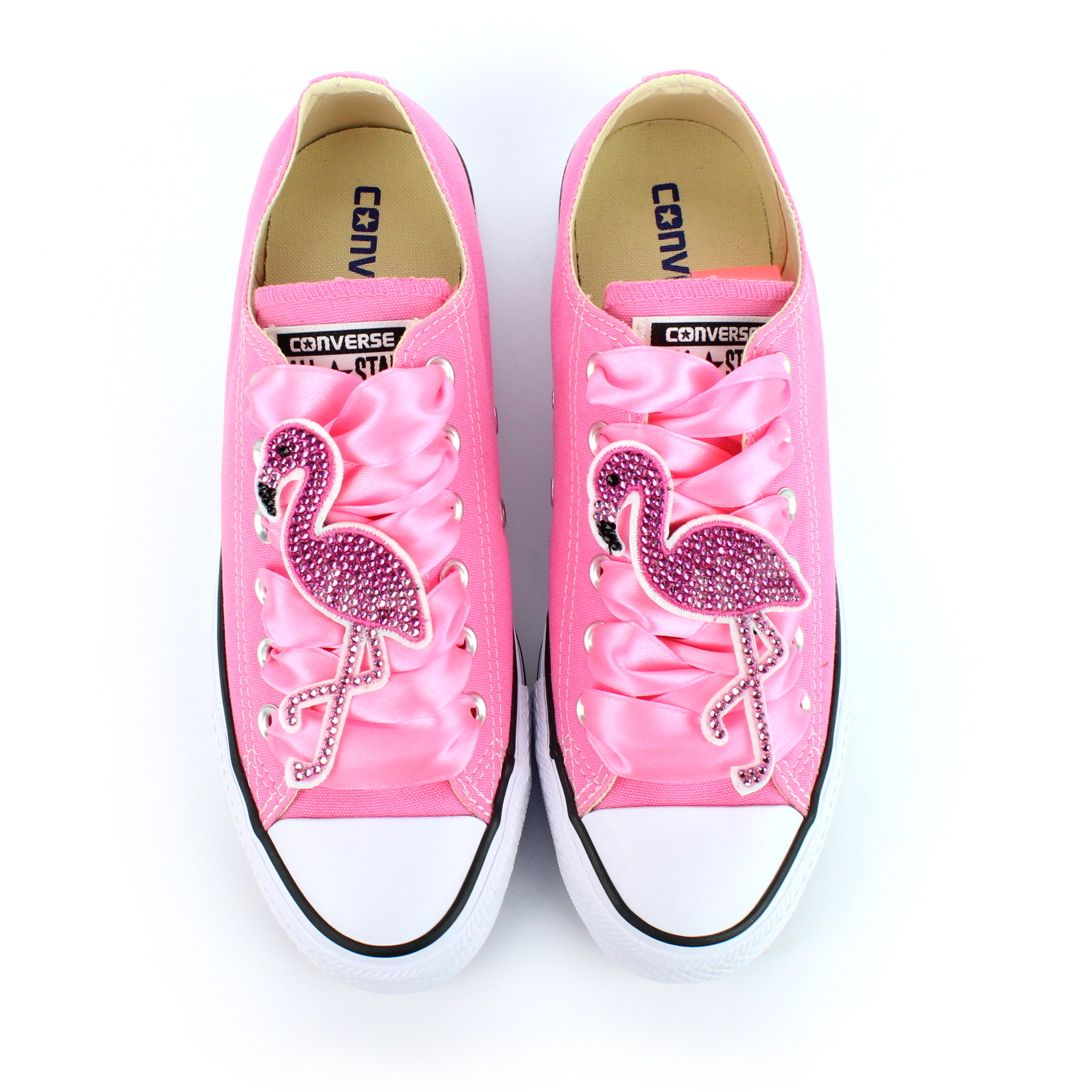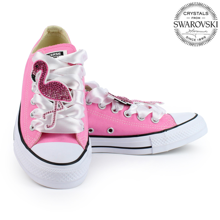 Nízke "Consy" v ružovej farbe sme pre teba urobili príťažlivejšími tak, že sme na šnúrky pridali ružového plameniaka. Krištáľového plameniaka, ktorý je ručne vyrobený z ružových Swarovski krištáľov. Aby to nebolo náhodou málo, môžeš si vybrať dve rôzne farby šnúrok. Biele, ktoré zvýraznia ružového plameniaka umiestneného presne na šnúrkach, alebo ružové. V tom je jedinečnosť Converse Flamingo Swarovski.