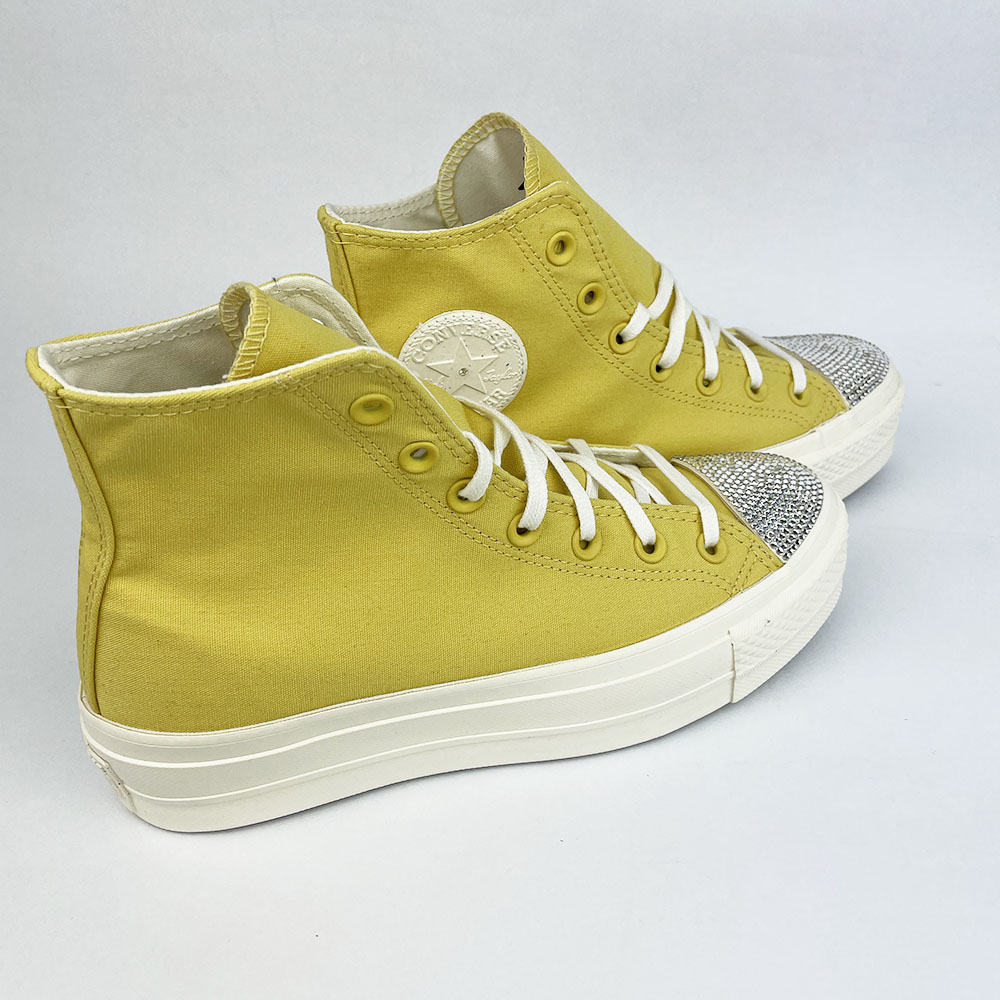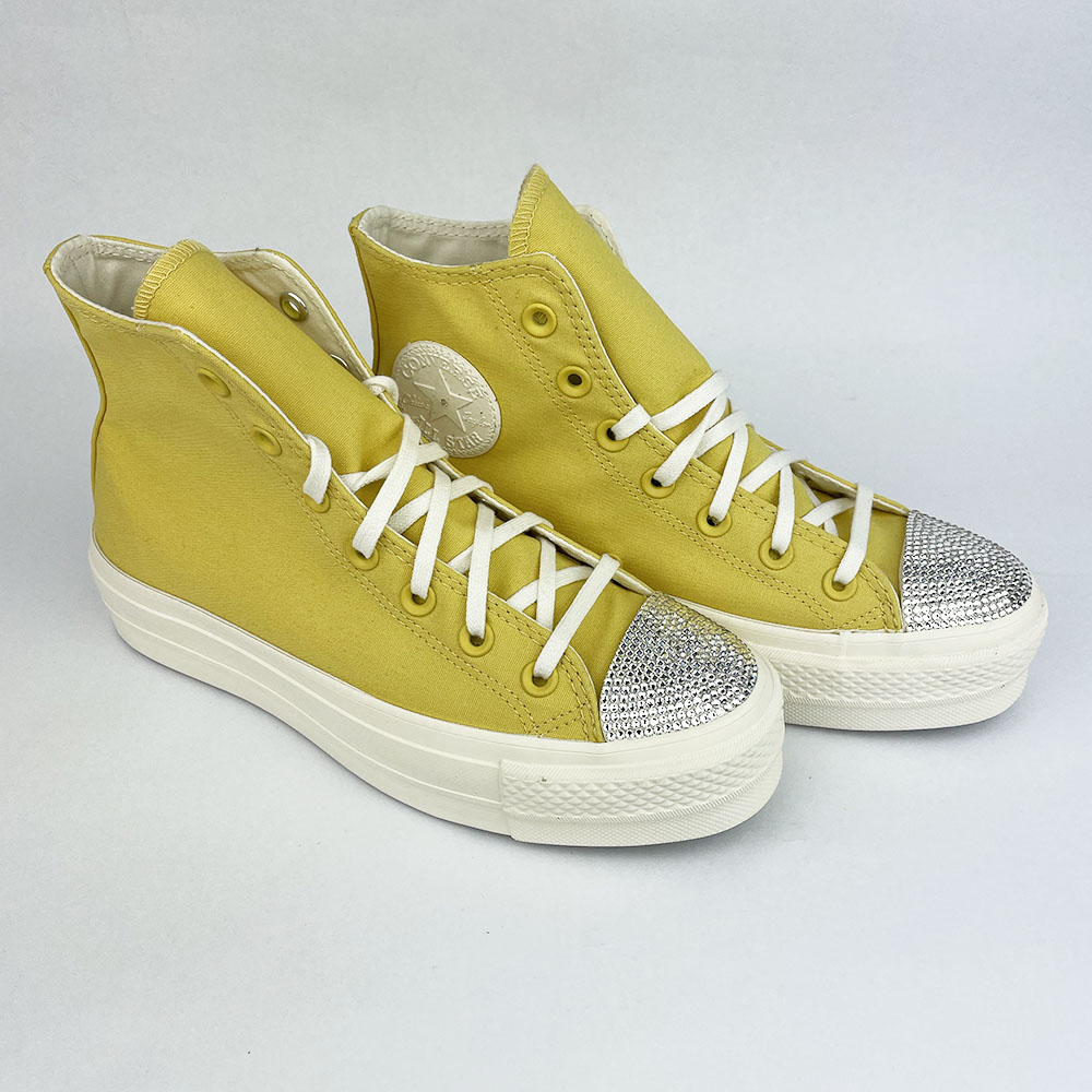 Shoozers ti prináša originálne a neprehliadnuteľné Converse Swarovski High Saturn Gold . Spojenie legendárnej a pohodlnej tenisky Converse v zaujímavej zlatožltej farbe s krištáľmi od Swarovski funguje dokonale. Hrubá platforma a strih k členkom Vás ochráni aj pred nepriaznivým počasím. Tenisky sú okrem iného vyrobené aj z recyklovaného materiálu.